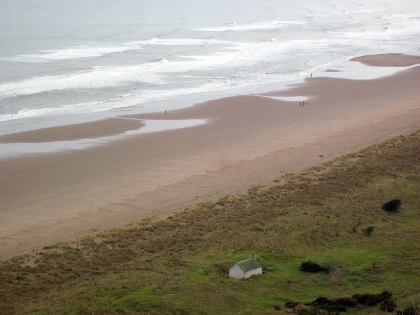 The beach, like many along the east coast, was once a workplace. The work has gone, along with the salmon nets until recently visible at low tide, but the fishing bothies remain, in the dunes between the cliff edge and the beach.
